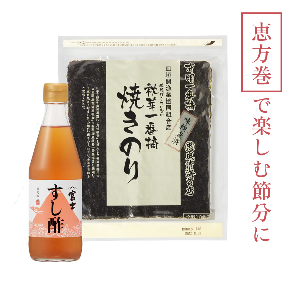 10年以上寝かせた酒粕から造った赤酢と、2種類米酢に塩を合わせて作った砂糖不使用の「富士手巻きすし酢」と海苔のセット。